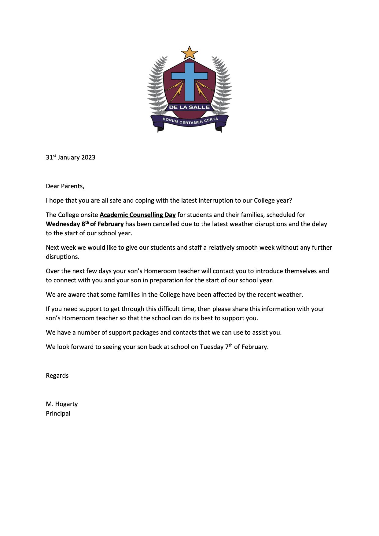 De La Salle College is closed and will re-open Monday 19 January 2026