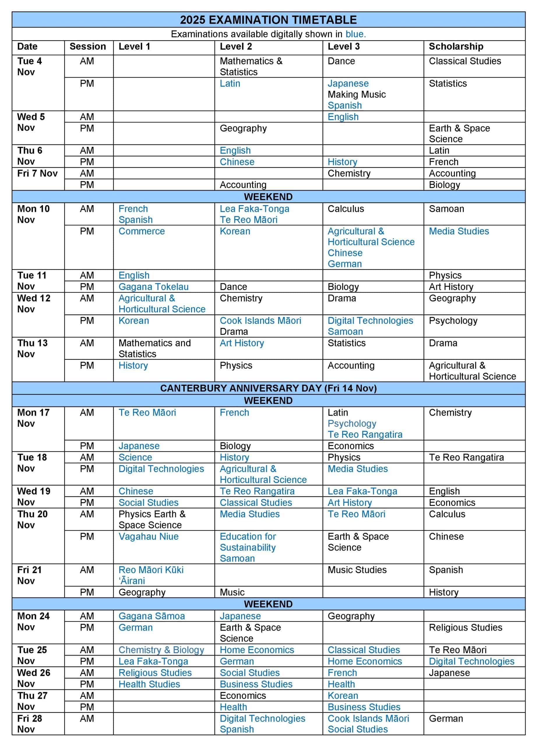 NCEA Examination Timetable