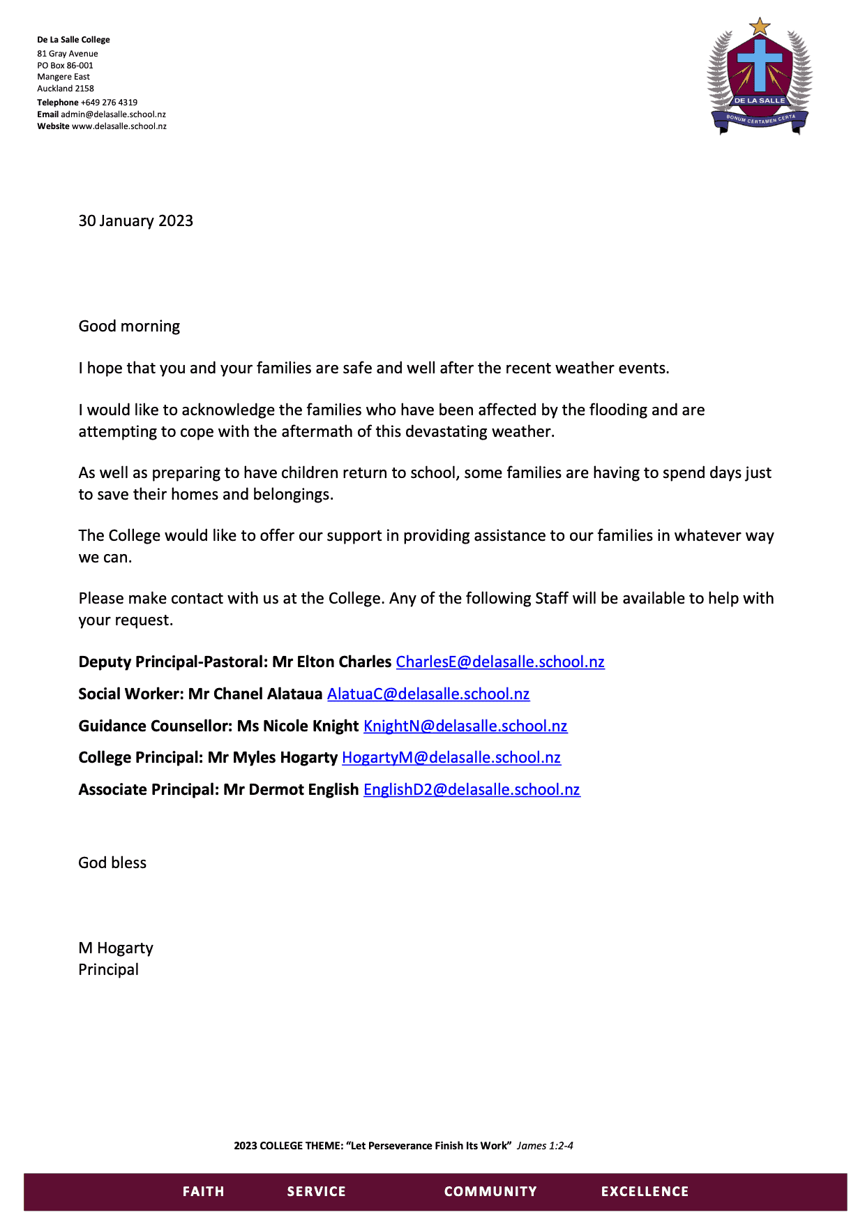 De La Salle College is closed and will re-open Monday 19 January 2026
