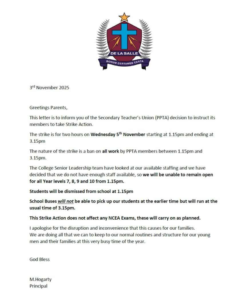 There will be a PPTA strike for two hours from 1:15 p.m. on Wednesday, 5 November. Students will be dismissed from school at 1:15 p.m.