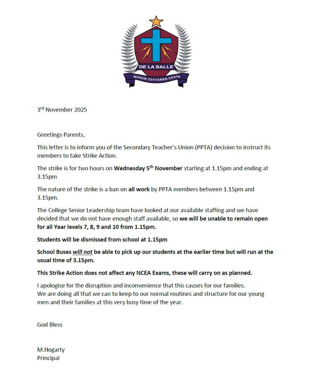 There will be a PPTA strike for two hours from 1:15 p.m. on Wednesday, 5 November. Students will be dismissed from school at 1:15 p.m.