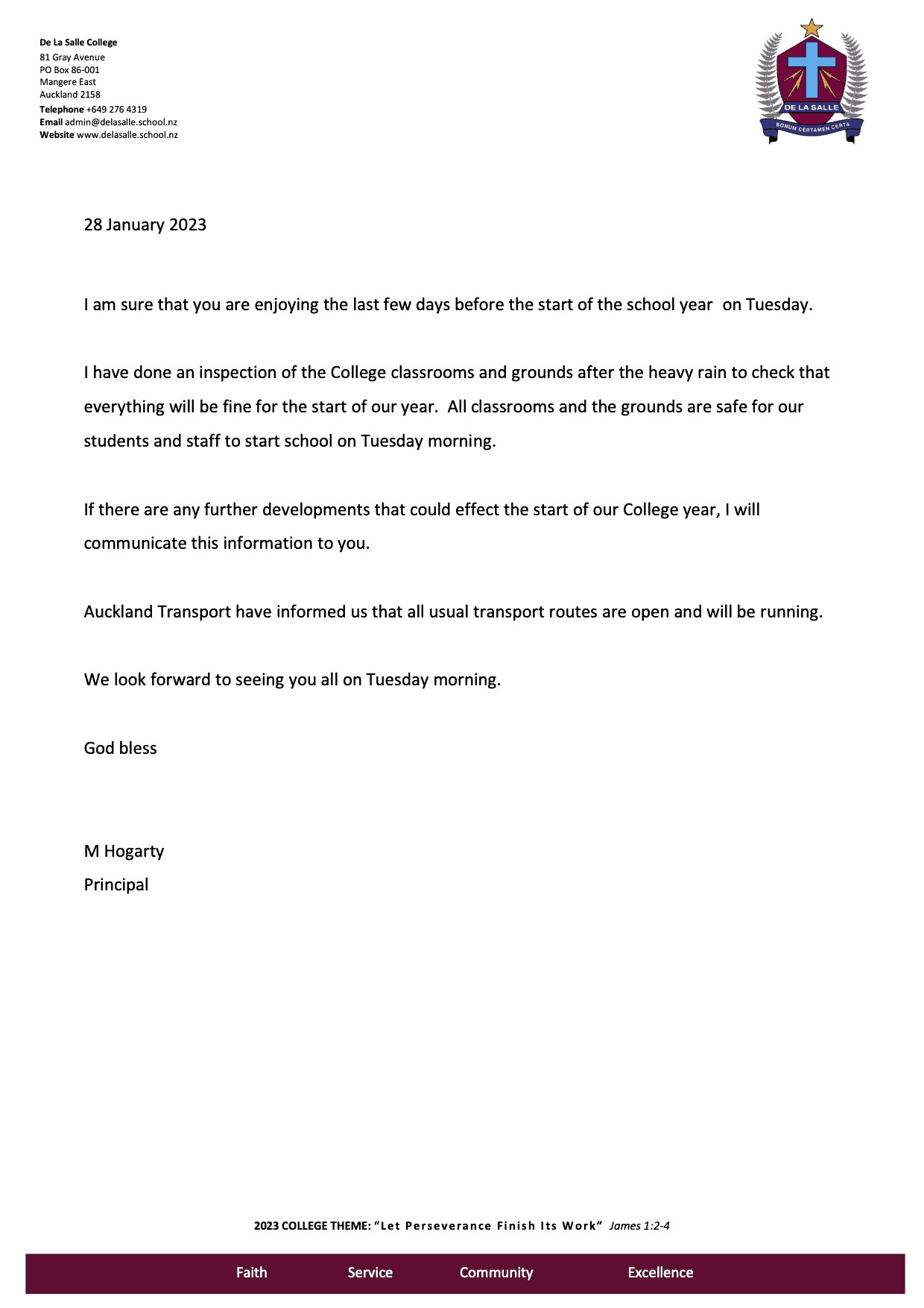 De La Salle College is closed and will re-open Monday 19 January 2026